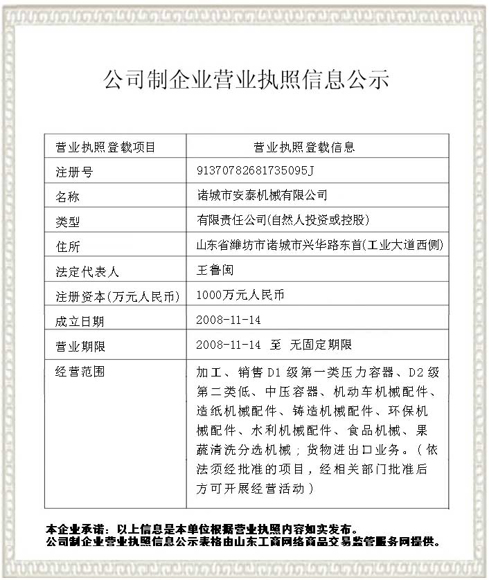諸城市安泰機(jī)械有限公司成立于2008年,是一家新興的技術(shù)型企業(yè),擁有D1/D2類(lèi)壓力容器設(shè)備設(shè)計(jì)和制造資質(zhì)以及ISO9001質(zhì)量認(rèn)證,資質(zhì)齊全,設(shè)備質(zhì)量保障,技術(shù)力量雄厚,檢測(cè)手段齊全,并通過(guò)SGS認(rèn)證,且有健全穩(wěn)定的質(zhì)保體系。