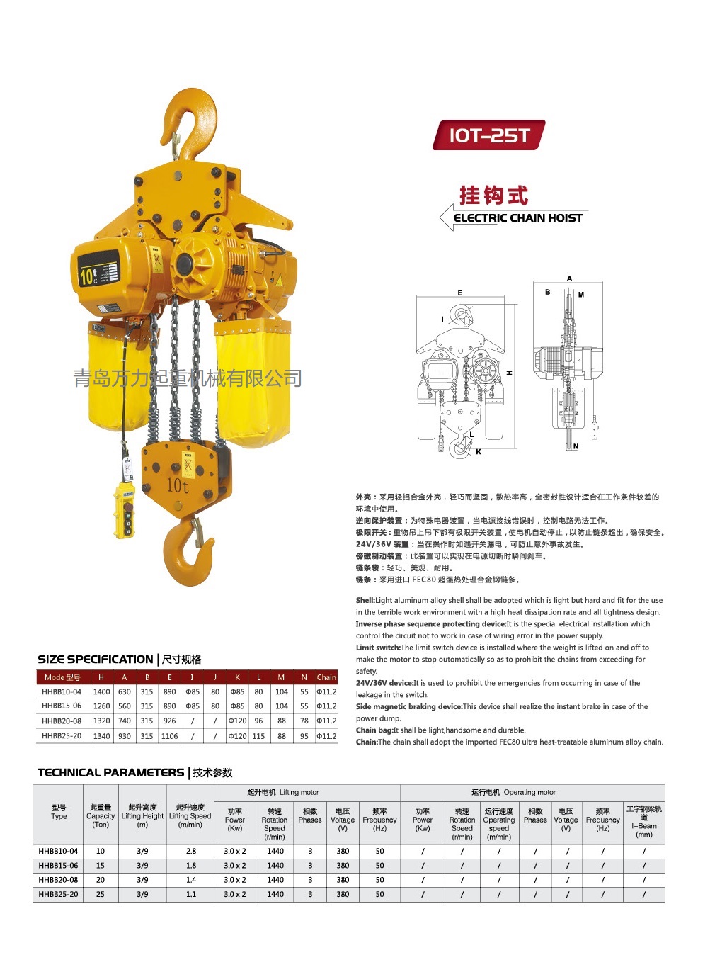 極限開關(guān):吊上吊下都有開關(guān)裝置,使自動停止,防止鏈條超出,確保安全。